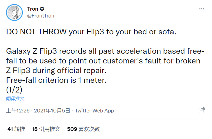 爆料者表示,有了这项纪录数据,手机在保修时即使外观没有损坏痕迹,三星也会以加速度数据拒绝免费维修。他还表示,不建议用户将 Galaxy Fold3 手机扔到床上或枕头上玩,这样会使得手机记录异常加速度数据。