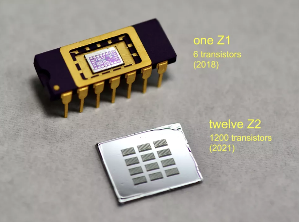 来到 2021 年,泽鲁夫制造了他的第二个芯片,命名为 Z2。这个芯片比 Z1 大了好几个数量级,有 1200 个晶体管,而 Z1 上只有 6 个。