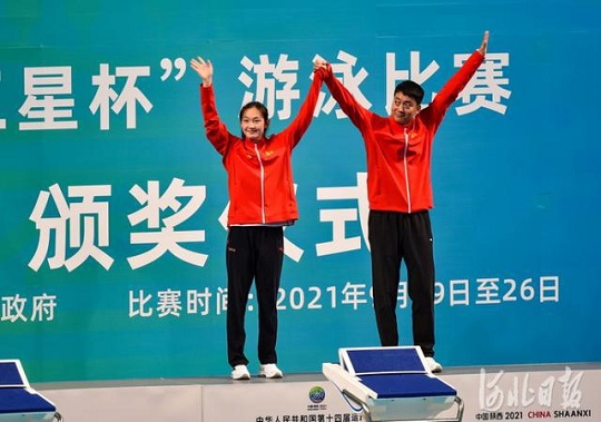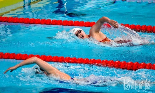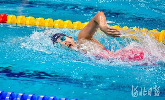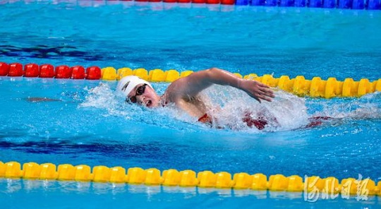 当日,中华人民共和国第十四届运动会游泳比赛在西安奥体中心游泳馆继续进行,在女子800米自由泳决赛中,河北选手李冰洁游出8分17秒39的成绩成功卫冕,拿下本届全运会个人第三枚金牌。另一位河北选手马永慧获得第六名,成绩是8分41秒83。河北日报记者耿辉摄影报道
