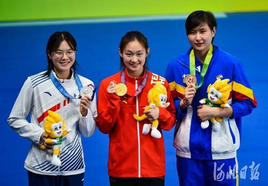 2021年9月25日,获得女子800米自由泳前三名的运动员:汤慕涵(左)、李冰洁(中)、王简嘉禾(右)。