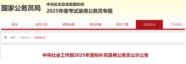 2025年国考公务员补录岗位公示正式发布,中央社会工作部确定张金旭等10名拟录用人员。本文详解补录流程、监督渠道及2026国考备考资源领取方式。