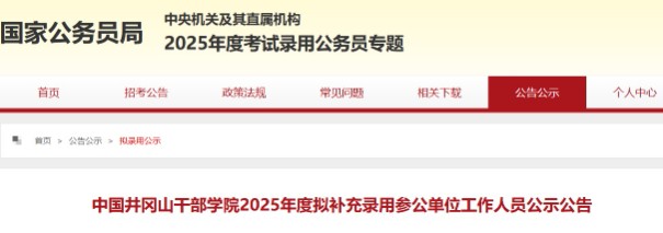 国家公务员补录网站近日发布公示,中国井冈山干部学院拟补充录用曹雅琪等4名同志为参公单位工作人员。本文详细介绍补录流程、岗位信息及公示详情,并提供2026国考备考资料领取通道。