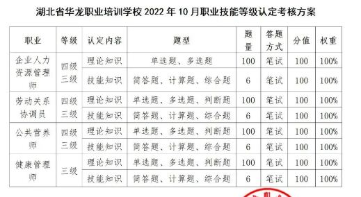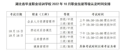 近日,本站编辑从湖北省级第三方备案机构湖北省华龙职业培训学校官微发布的《2022年10月职业技能等级认定公告》可知,2022年湖北省10月批次考试时间为10月15日至16日,意向报考本批次健康管理师考试的人员要重点关注。