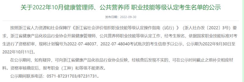 近日,本站编辑从浙江省健康产品化妆品行业协会官网发布的《关于2022年10月健康管理师、公共营养师