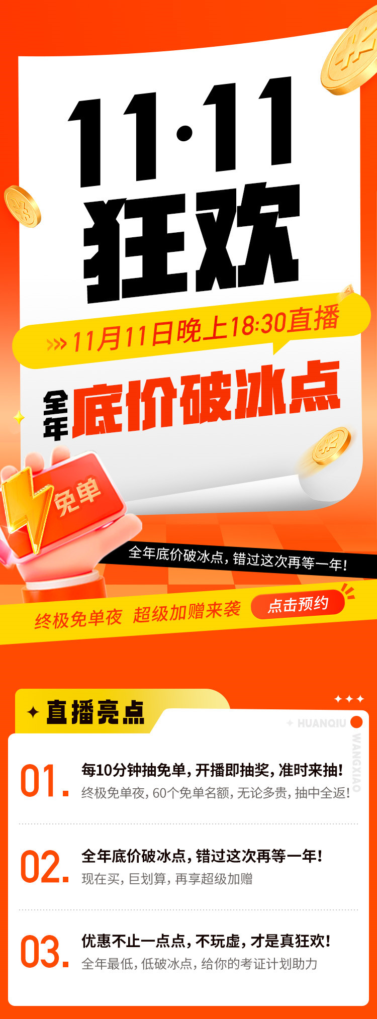 环球网校11月11日晚18:30线上直播,全年低价破冰点,证越多,挣越多!还等什么,速来围观,终极免单夜,超级加赠来袭。点击此处可预约直播>>