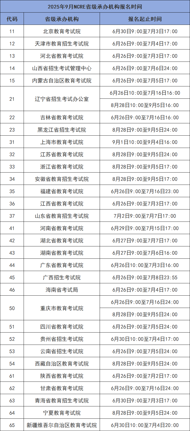 2025年9月计算机二级各省报名时间不同,大部分在6月26日开始报名,结束时间不同,有的省份报名已经结束,详细信息小编为大家整理如下: