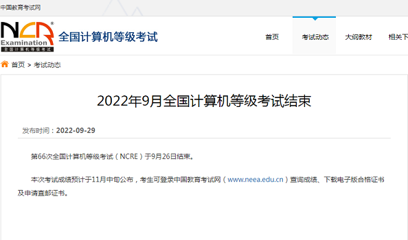 中国教育考试网发布《2022年9月全国计算机等级考试结束》