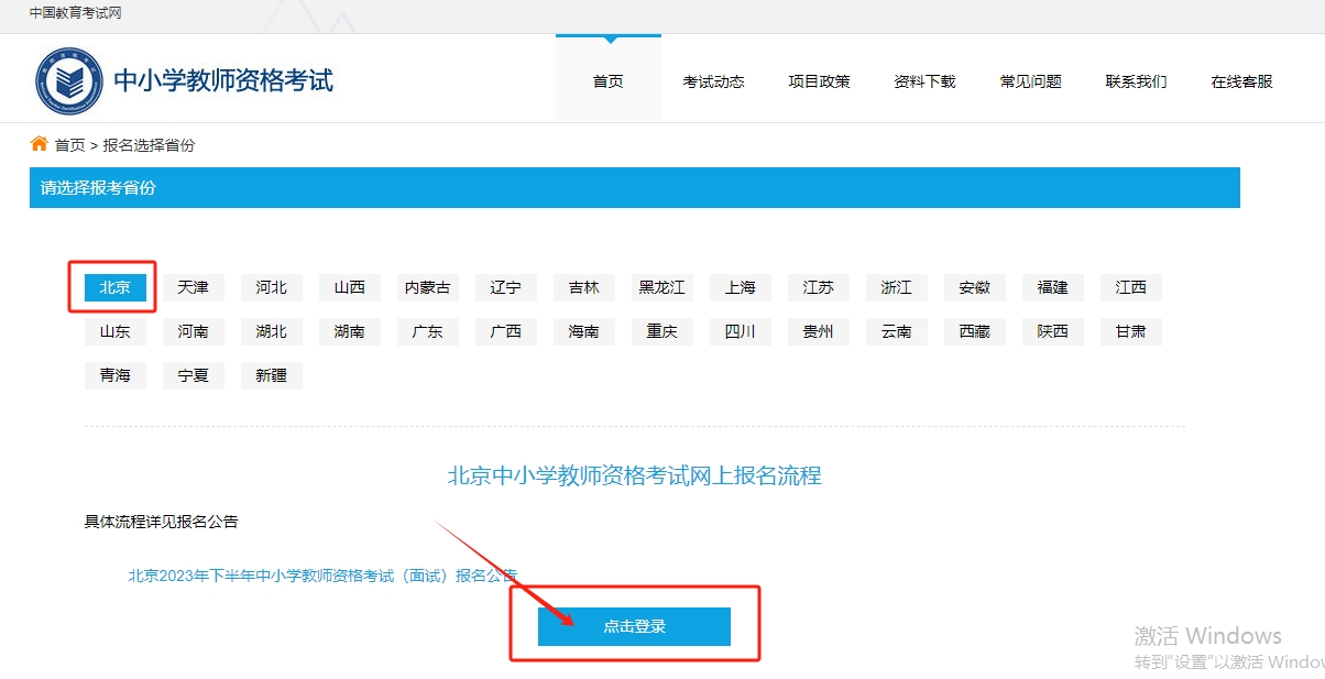 考生进入报名系统后,选择好报名省份,点“点击登录”。