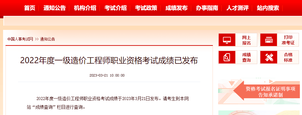 根据中国人事考试网发布的《2022年度一级造价工程师职业资格考试成绩已发布》可知,2022年度一级造价师考试成绩已在2023年3月21日开始查询,查分网站为中国人事考试网“成绩查询”栏目。
