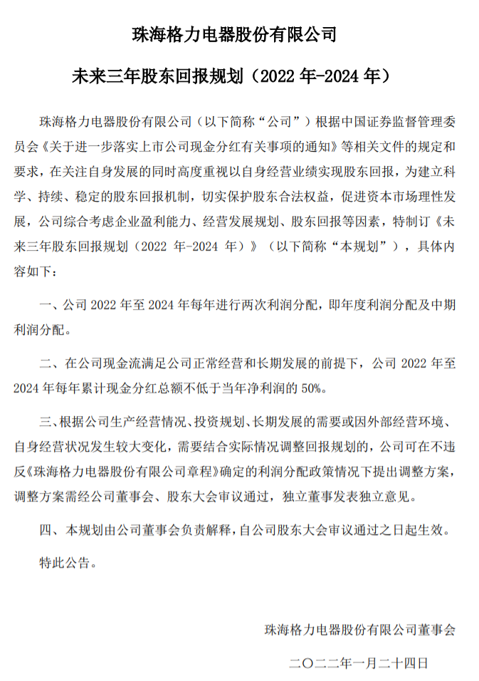 1 月 25 日消息,昨日晚间,格力电器披露了未来三年股东回报规划(2022 年-2024 年),在公司现金流满足公司正常经营和长期发展的前提下,公司 2022 年至 2024 年每年累计现金分红总额不低于当年净利润的 50%。