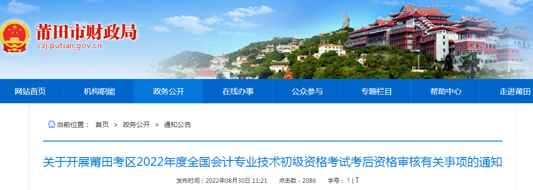 近日,莆田市财政局发布了《关于开展莆田考区2022年度全国会计专业技术初级资格考试考后资格审核有关事项的通知》,通知中明确了2022年福建莆田初级会计考试考后资格审核时间为9月19日至23日,关于资格审核的相关事宜由本站编辑整理,内容如下。
