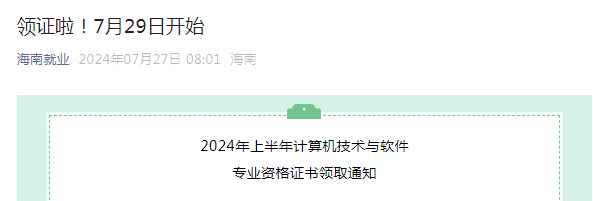 海南就业微信公众号发布了《2024年上半年计算机技术与软件专业资格证书领取通知》,由通知可知,海南2024年上半年计算机软考高项合格证书自7月29日起开始领取,合格人员可选择现场或邮寄领取证书。