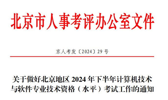 根据原北京市人事局、原北京市信息化工作办公室《关于转发人事部、信息产业部〈关于印发《计算机技术与软件专业技术资格(水平)考试暂行规定》和《计算机技术与软件专业技术资格(水平)考试实施办法》的通知〉的通知》(京人发〔2003〕138号),全国计算机专业技术资格考试办公室《关于2024年度计算机技术与软件专业技术资格(水平)考试工作安排及有关事项的通知》(计考办〔2024〕1号)精神,现将北京地区2024年下半年计算机技术与软件专业技术资格(水平)考试(以下简称2024年下半年计算机软件资格考试)有关事宜通知如下: