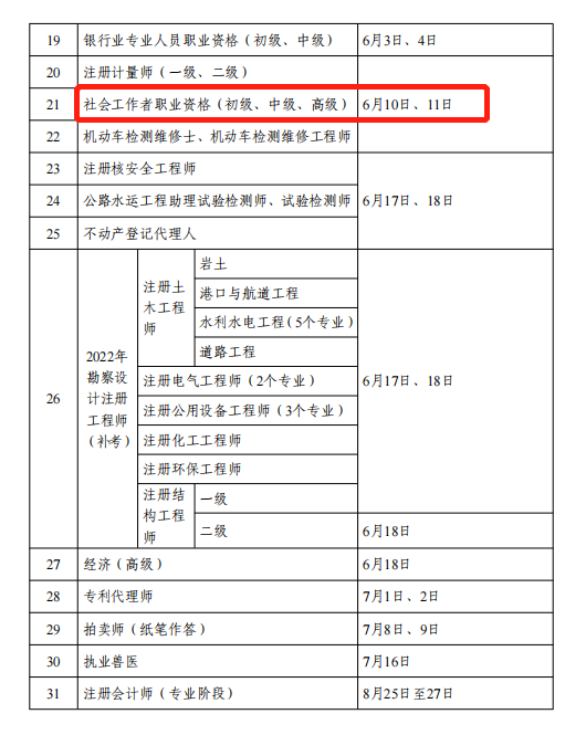 中国人事考试网近日发布《2023年度专业技术人员职业资格考试工作计划》,2023年社会工作者职业水平考试时间定于6月10-11日进行,在此提醒考生认真备考,按时报名并准时参加考试。