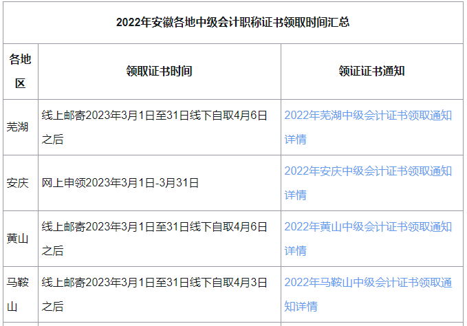 2月24日,芜湖、黄山、安庆等市财政局发布了关于2022年度会计专业技术中级资格证书发放工作的通知,确定线上邮寄时间为2023年3月1日至31日,线下自取时间各市略有不同。