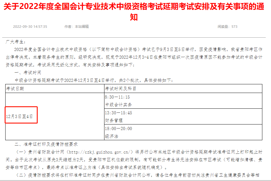 近日贵州省财政会计网发布“关于2022年度全国会计专业技术中级资格考试延期考试安排及有关事项的通知”明确,延期地区2022年中级会计师考试时间定于12月3日至4日,准考证打印时间另行通知!