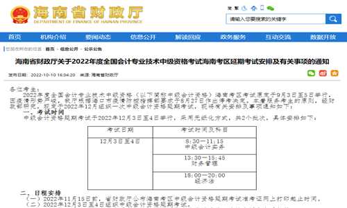 10月10日,海南省财政厅发布关于2022年度全国会计专业技术中级资格考试海南考区延期考试安排及有关事项的通知,指出延考安排在12月3日至4日,具体日程安排见公告原文: