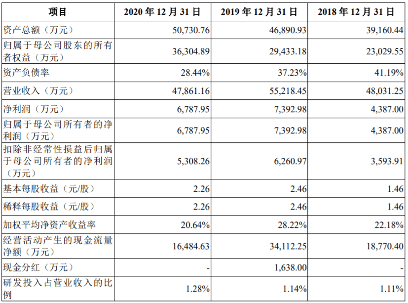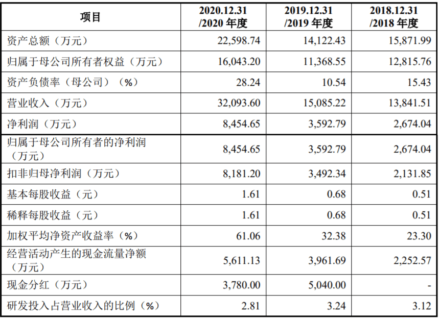 2018年至2020年,雅艺科技实现营业收入分别为1.38亿元、1.51亿元、3.21亿元;同期实现归属于母公司所有者的净利润分别为2674.04万元、3592.79万元、8454.65万元。