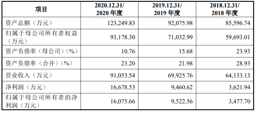 2018年至2020年,唯科模塑实现营业收入分别为6.41亿元、6.99亿元、9.11亿元;同期实现归属于母公司所有者的净利润分别为3477.70万元、9522.56万元、1.61亿元。