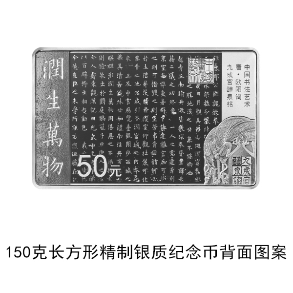150克长方形银质纪念币背面图案为唐代欧阳询书《九成宫醴泉铭》局部碑文及“润生万物”字样与碑额、“中国书法艺术”篆刻钤印等组合设计,并刊“中国书法艺术·唐·欧阳询·九成宫醴泉铭”字样及面额。