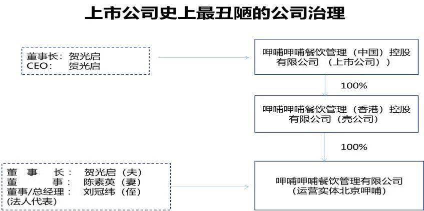 开曼呷哺是符合上市规定的股东会与董事会的最低要求,但是其主体实际业务的运营公司,也就是北京呷哺,其实际控制权全部掌握在贺光启家族手中,完全架空董事会与股东会,即上市公司最主要的运营实体完全被上市公司的大股东掌控。正如上文所言,“这在任何资本市场都是足以引发投资者警惕的危险设计。”