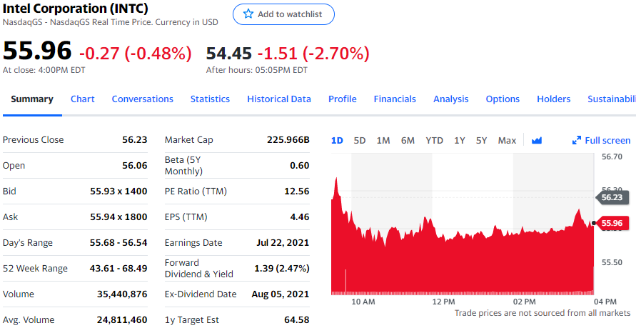 常规交易中英特尔跌 0.27 美元,跌幅为 0.48%,报收于 55.96 美元。盘后交易中英特尔一度下跌 1.51 美元,跌幅达到 2.7%,暂报 54.45 美元。