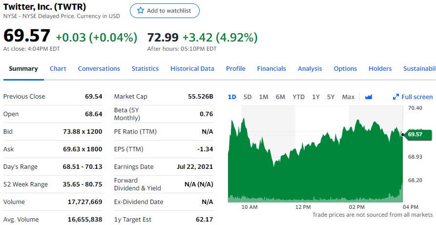 推特发布超过华尔街预期的第二季度业绩后,盘后交易中 特推股价涨幅一度达到 9%。今天常规交易中,特推股价上涨 0.03 美元,涨幅为 0.04%,报收于 69.57 美元。