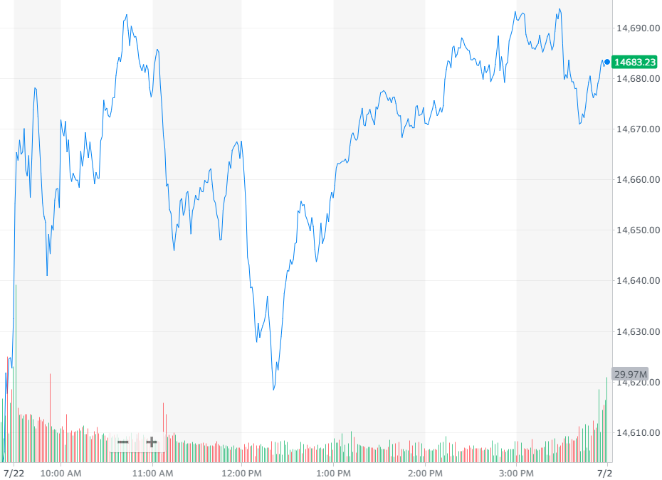 北京时间 7 月 23 日消息,尽管上周美国初请失业人数意外超过分析师预期,但并未逆转美股上涨的趋势。截至收盘,道指涨 25.35 点,涨幅为 0.07%,报收 34823.35 点;标普 500 指数涨 8.79 点,涨幅为 0.2%,报收 4367.48 点;纳指涨 52.64 点,涨幅为 0.36%,报收 14684.6 点。