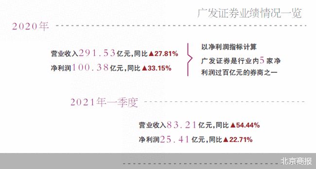 数据显示,广发证券2020年营业收入为291.53亿元,同比增长27.81%;净利润为100.38亿元,同比增长33.15%,以净利润指标计算,广发证券是行业内5家净利润过百亿元的券商之一。今年一季度,广发证券实现营业收入为83.21亿元,同比增长54.44%;净利润为25.41亿元,同比增长22.71%。