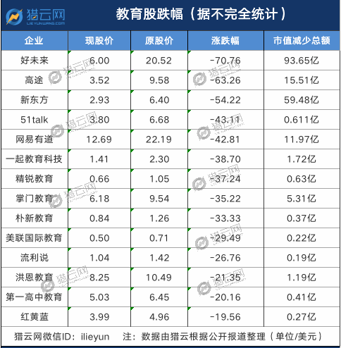 其中,好未来暴跌 70%,每股从 20.52 美元跌至 6 美元,市值蒸发 93.65 亿美元,折合 606 亿人民币。