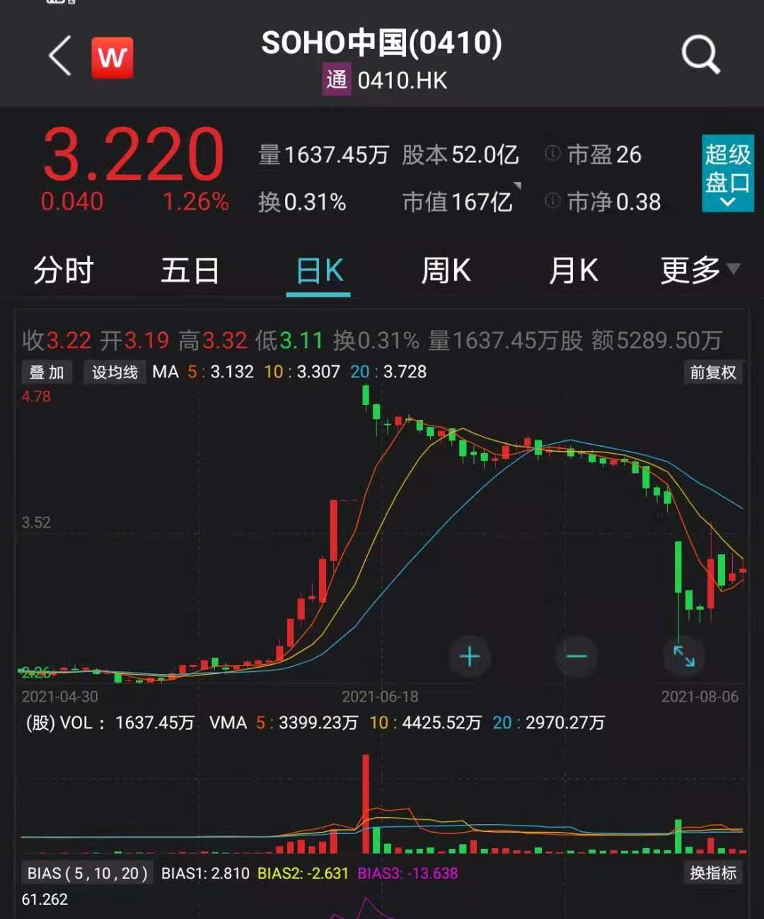 截至8月6日收盘,港股上市的SOHO中国收于3.22港元,市值167亿港元。