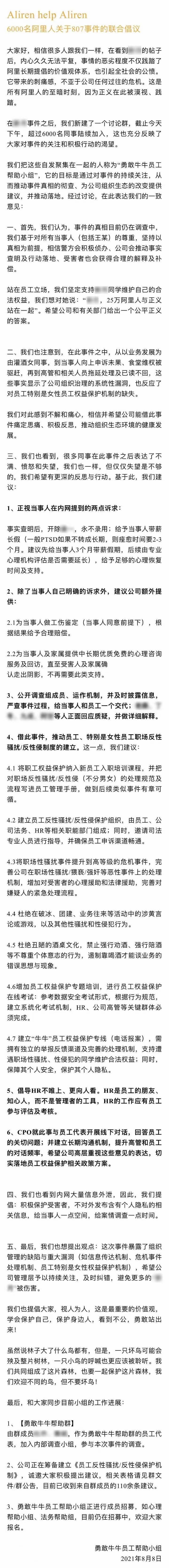 8日,“勇敢牛牛员工帮助小组”在Aliren help Aliren发布《6000名阿里人关于807事件的联合倡议》,倡议认为,事实显示了公司组织治理的系统性漏洞,也反映了对员工特别是女性员工权益保护机制的缺失。希望公司借此事件,推动员工特别是女性员工职场反性骚扰、反性侵制度的建立。
