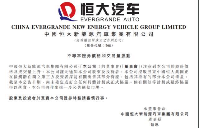 就在中国恒大集团发布公告的同时,恒大汽车也发布了类似的公告。