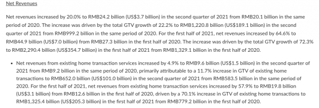 8 月 12 日消息,贝壳今天对外发布了 2021 年第二季度及上半年业绩。数据显示,2021 年上半年,贝壳营业收入达 449 亿元,同比增长 64.6%,调整后净利润为 31.40 亿元。