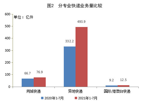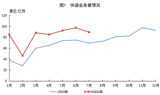 1-7 月,全国快递服务企业业务量累计完成 583.3 亿件,同比增长 42.9%;业务收入累计完成 5669.4 亿元,同比增长 24.7%。其中,同城业务量累计完成 76.9 亿件,同比增长 15.2%;异地业务量累计完成 493.9 亿件,同比增长 48.7%;国际/港澳台业务量累计完成 12.5 亿件,同比增长 35.7%。