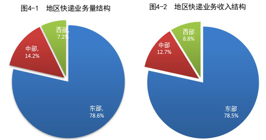以下为我国 1-7 月分地区快递业务量和收入情况: