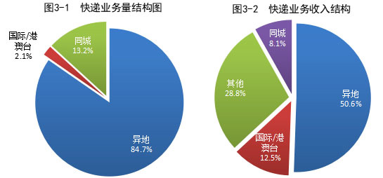 今年 1-7 月,同城、异地、国际/港澳台快递业务量分别占全部快递业务量的 13.2%、84.7% 和 2.1%;业务收入分别占全部快递收入的 8.1%、50.6% 和 12.5%。与去年同期相比,同城快递业务量的比重下降 3.1 个百分点,异地快递业务量的比重上升 3.3 个百分点,国际/港澳台业务量的比重下降 0.2 个百分点。
