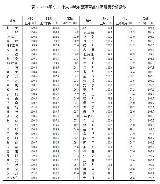 北京8月16日电 (申佳平)今日,国家统计局发布2021年7月份70个大中城市商品住宅销售价格变动情况。国家统计局城市司首席统计师绳国庆表示,2021年7月份,70个大中城市商品住宅销售价格环比、同比涨幅总体回落。