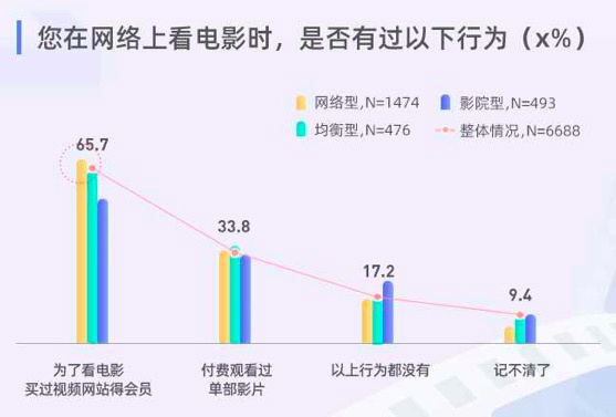《研究》数据显示,调查中 62.5% 的用户对于院线电影与网络电影的认知边界十分模糊,而超过 75% 的用户并不在意电影是在院线上映还是网络播出。长视频平台上,有 65.2% 的用户更常进行网络观影。用户市场的态度更加多元与开放,电影的放映形式并不影响用户对电影的感观。