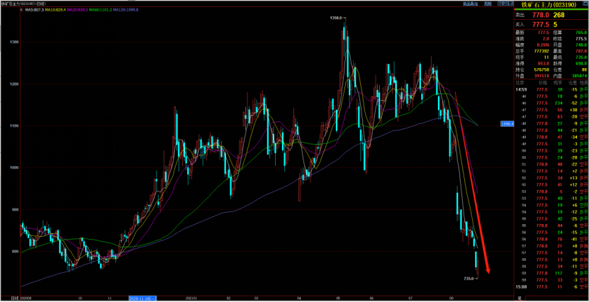 铁矿石价格在剧烈下跌。在期货市场上,铁矿石期货主力合约自7月16日以来一路下跌,从高点1132.5元/吨一度跌落至761元/吨,20日报收777.5元/吨。一个月的时间跌幅超30%,创去年10月以来新低,而现货价格也随之不断走低。