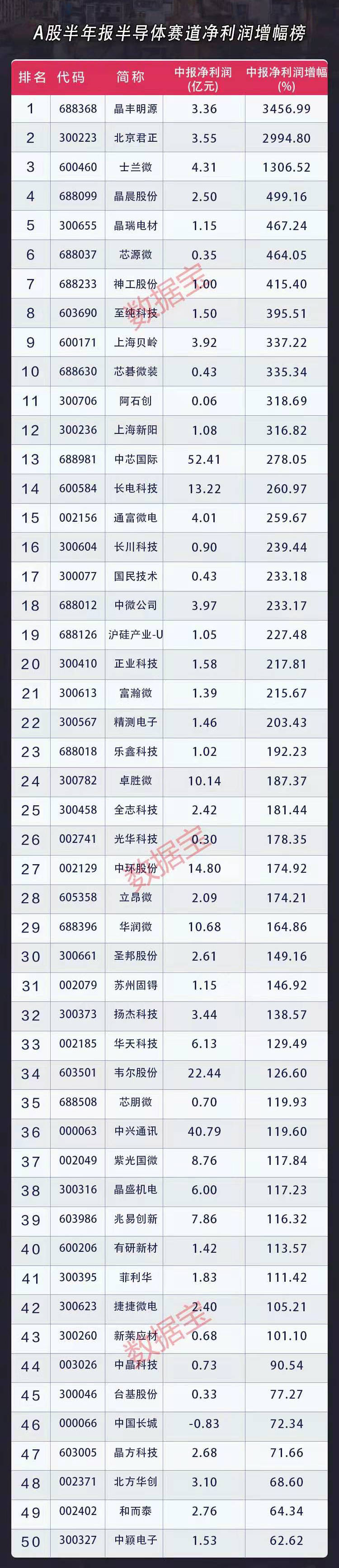 数据宝以净利润增幅为分析对象,发布《A股半年报半导体赛道净利润增幅榜》,榜单前50家公司半年报净利润增幅均超过60%,与2020年同期相比,21家公司新进榜单50强,如第11名的阿石创、第12名的上海新阳。