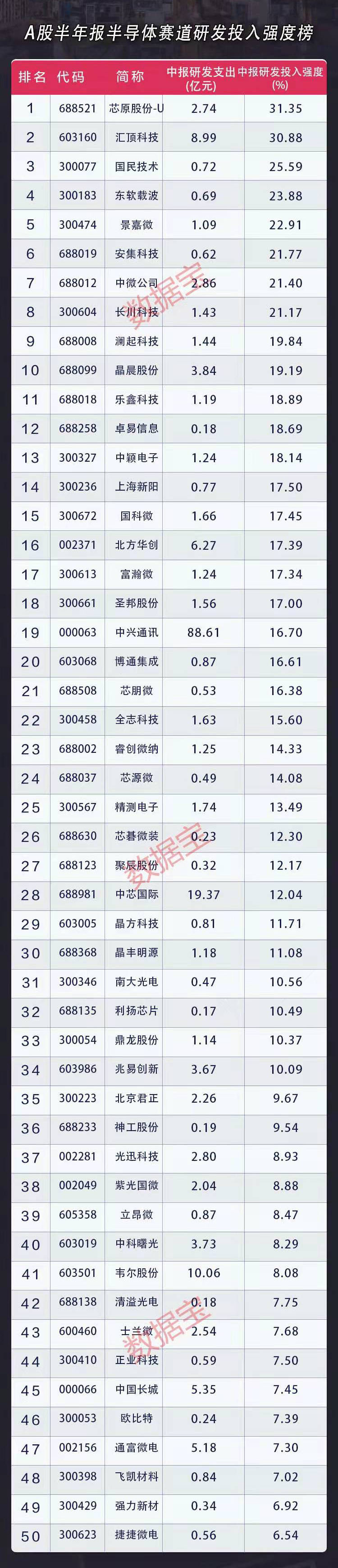数据宝以研发投入强度为对象,发布《A股半年报半导体赛道研发投入强度榜》,榜单前50强公司的研发投入强度均超过6.5%,居榜首的是芯原股份-U,研发投入强度高达31.35%,较去年同期提升1个名次,汇顶科技以30.88%的研发投入强度居第二位,较去年同期提升5个名次。国民技术、东软载波及景嘉微分别居榜单第三、第四及第五位,研发投入强度均超过22%;去年同期居第一位的国科微,今年位居榜单第15位,2021年半年报研发投入强度降至17.45%。