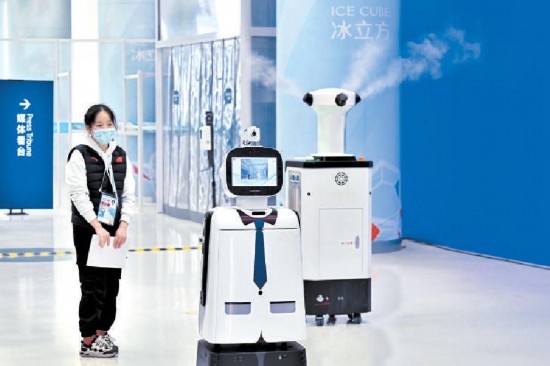 昨天,在举办“相约北京·昆泰”2021年世界轮椅冰壶锦标赛的国家游泳中心,消毒机器人和防疫提示机器人在场馆内提供服务。 本报记者 邓伟摄