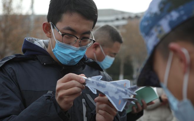 前来咨询的学生被国产战斗机模型吸引。新京报记者 王嘉宁 摄
