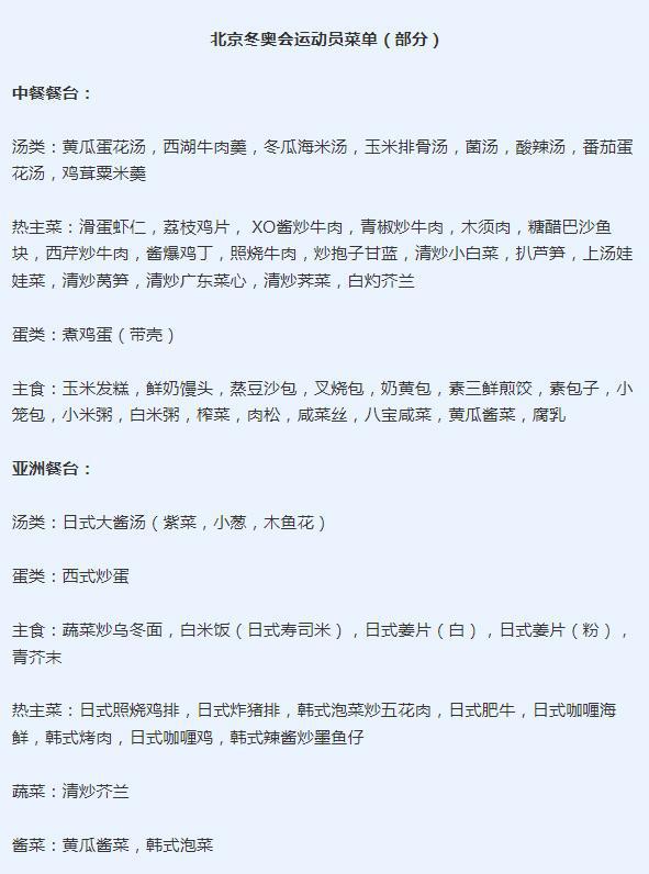 运动员菜单的设计中西兼顾,中餐和西餐的比例为3∶7。食材品种丰富,超过400种各类食材,单是披萨就有玛格丽特披萨、烟熏鸡肉披萨等9种。