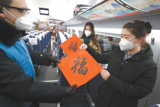 “乘务组夜里3点半起床,比平时更早抵达站台。列车一进站,大伙儿就忙着布置车厢,希望旅客的回家路更温馨。”列车长靳艳清说,冬奥会即将开幕,恰逢中国人最重要的节日春节,她希望能跟旅客一同写下新年祝福,为国家加油、为自己加油。