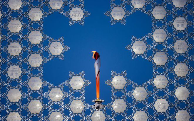 奥运之火在主火炬“大雪花”中心燃起。图/IC photo