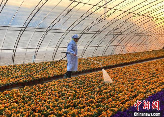 北京市绿地养护管理事务中心苗圃内,工人正为角堇浇水。徐婧 摄