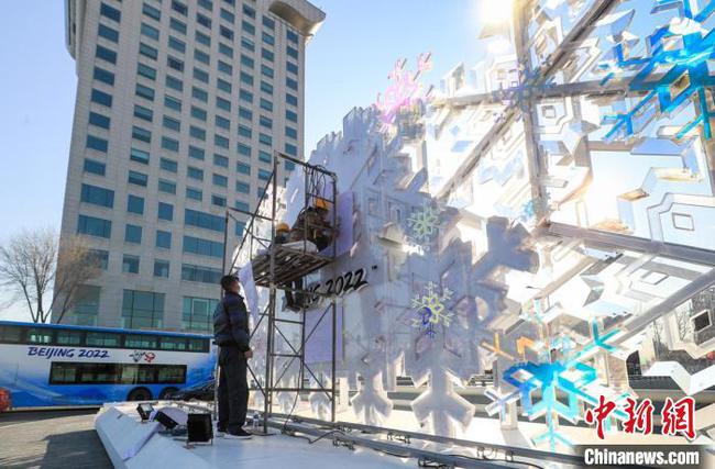 24日,北京奥林匹克中心区,工人正对冬奥景观“冰雪盛会”进行转换。中新社记者 贾天勇 摄