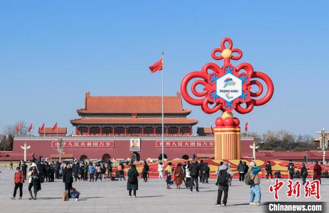 24日,天安门广场的“精彩冬奥”花坛,北京冬奥会会徽已转换为北京冬残奥会会徽。中新社记者 贾天勇摄